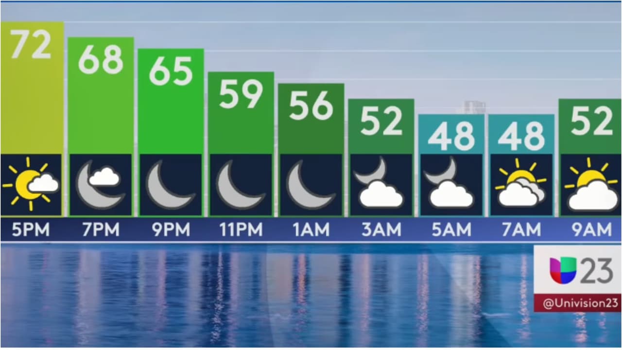 Miami amanece con un cielo parcialmente cubierto que promete un día agradable. La máxima alcanzará los 78.8 ºF (26 ºC) y los vientos del noreste soplarán entre 10 y 15 millas por hora, creando un ambiente fresco en la mañana que invita a disfrutar de un café cubano al aire libre.