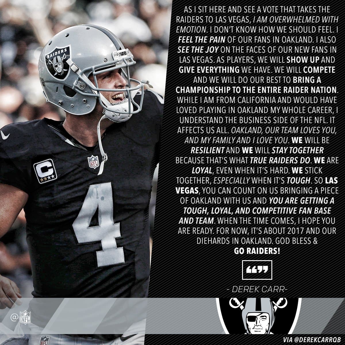 "¡Oakland, nuestro equipo te ama, y mi familia y yo te amamos! Vamos a ser fuertes y vamos a estar juntos, porque eso es lo que los verdaderos Raiders hacen. Somos leales, aun cuando es difícil. Nos mantenemos juntos, especialmente cuando es difícil, "escribió Carr.