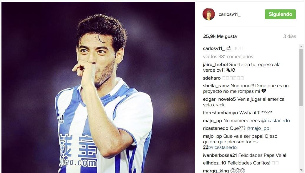 Le delantero mexicano Carlos Vela publico en su cuenta de Instagram un texto oculto (🔜 🍼👶🏼) en el que aparece un bebé seguido de un flecha y la palabra ‘soon’, indicando que será papá.