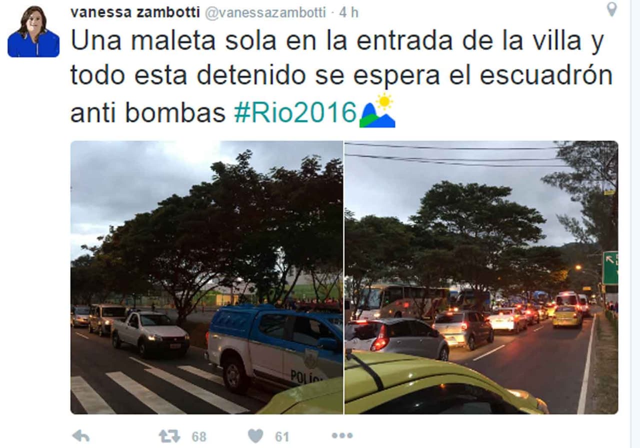 5:00 pm ET.- La veterana judoca mexicana, Vanessa Zambotti, denuncia una maleta sospechosa cerca de la Villa Olímpica, todo está en orden pero causa que una zona de la capital brasileña entre en caos.