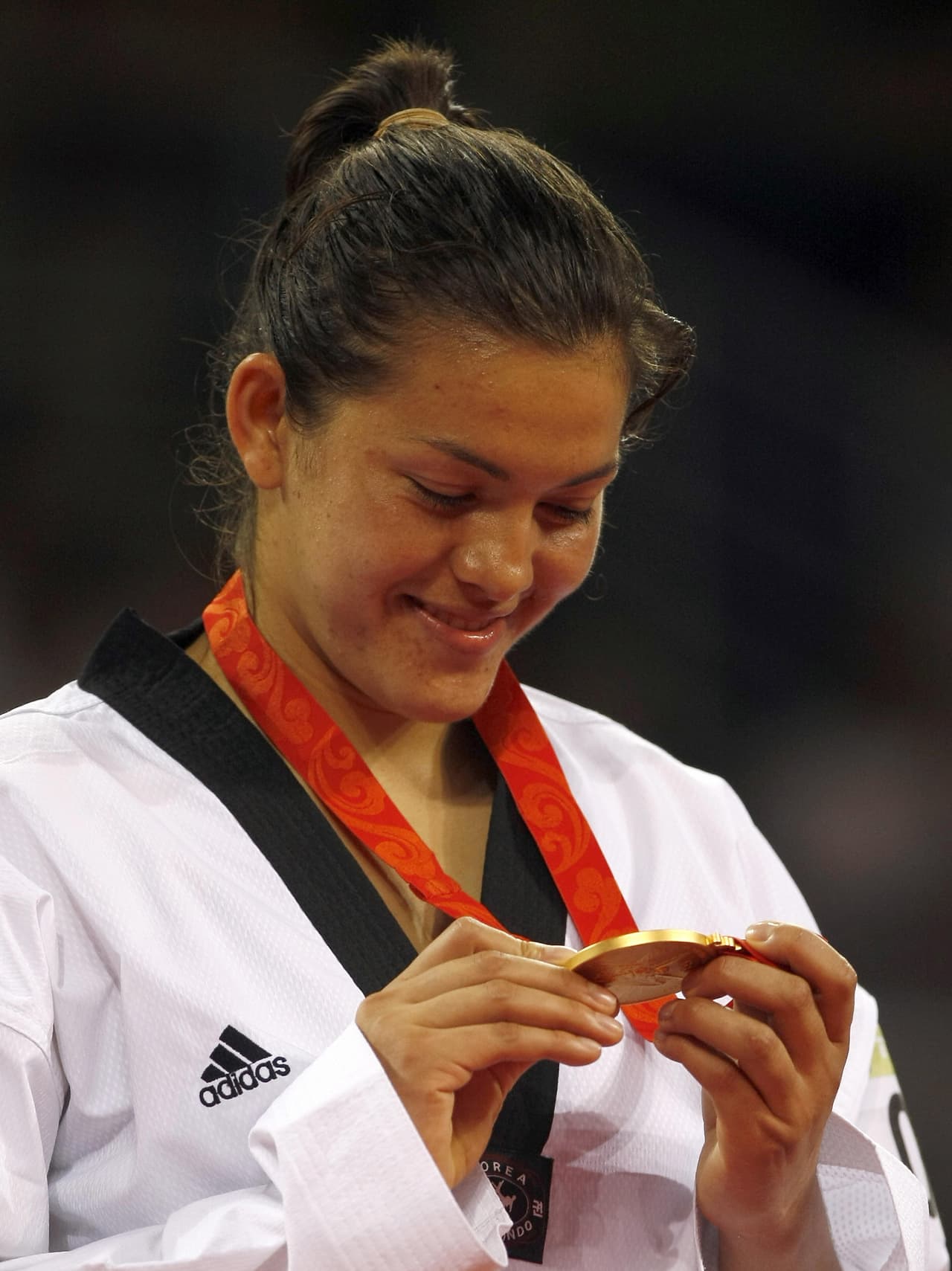 La primera es María del Rosario Espinoza, quien cantó el Himno Nacional Mexicano como la campeona del Taekwondo en la categoría de más de 67 kilogramos en los Juegos Olímpicos de Pekín 2008.