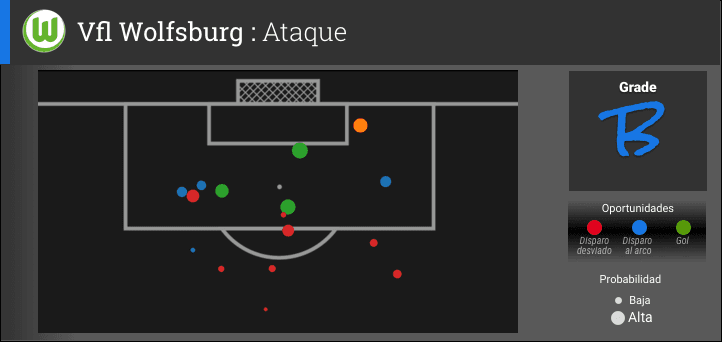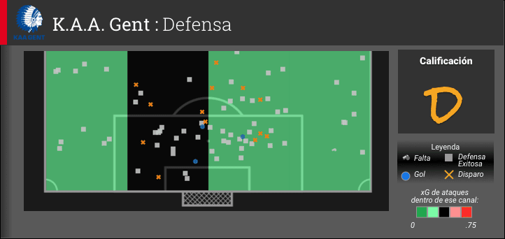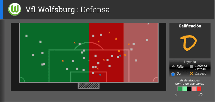 Wolfsburg no fue probado durante gran parte del partido, limitando las acciones defensivas necesarias de su línea trasera, pero los canales en color rojo en el grafico marcan claramente su debilidad. El defensa Sebastian Jung se lesiono temprano en el partido intentando una entrada contra Nana Asare y salió del partido al medio tiempo. Jung fue reemplazado por el ex jugador de Chelsea Andre Schürrle pero la sustitución no fue suficiente para evitar la respuesta de dos goles del Gent, los dos llegando por la banda derecha de Los Lobos.