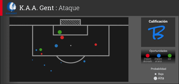 Cuando Max Kruse del Wolfsburg anotó el tercer gol en el minuto 60 se pensó que el juego ya había terminado por goleada, pero Gent continuó luchando por la banda derecha de los lobos. Con una un valor de expectativa de gol xG de 1.02, Wolfsburg convirtió 3 de sus 4 tiros en goles. Sin embargo, desperdicio tres oportunidades desviándolas y mandando una cuarta al poste.