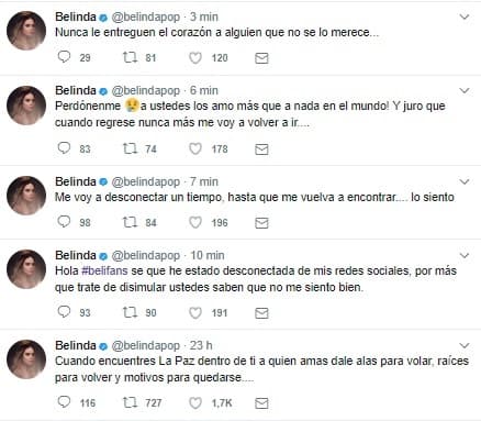 Fue hasta la mañana del 16 de julio que Belinda escribió en su cuenta de Twitter cuatro mensajes que fueron contundentes, donde avisaba a sus seguidores que cerraría su cuenta hasta estar bien, para de nuevo acercarse a ellos: “Sé que he estado desconectada de mis redes sociales, por más que traté de disimular, ustedes saben que no me siento bien. Me voy a desconectar un tiempo hasta que me vuelva a encontrar… lo siento”.