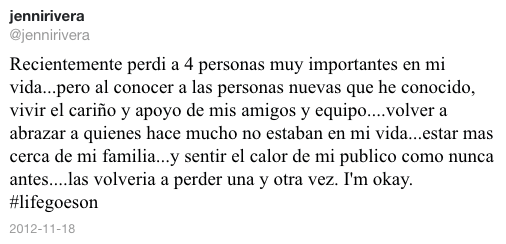 El 18 de noviembre de 2012, cuando Jenni Rivera publicó un tuit en el que expuso que había perdido a cuatro personas importantes en su vida, se refería a Esteban Loaiza, Chiquis Rivera, Juan Rivera y su amiga Elena Jiménez.