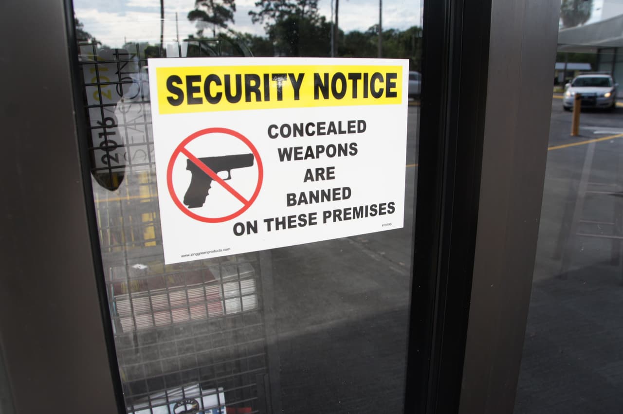 Bajo el rótulo se ve otro que reza "Aviso de seguridad: Ninguna arma oculta está permitida en estas instalaciones".