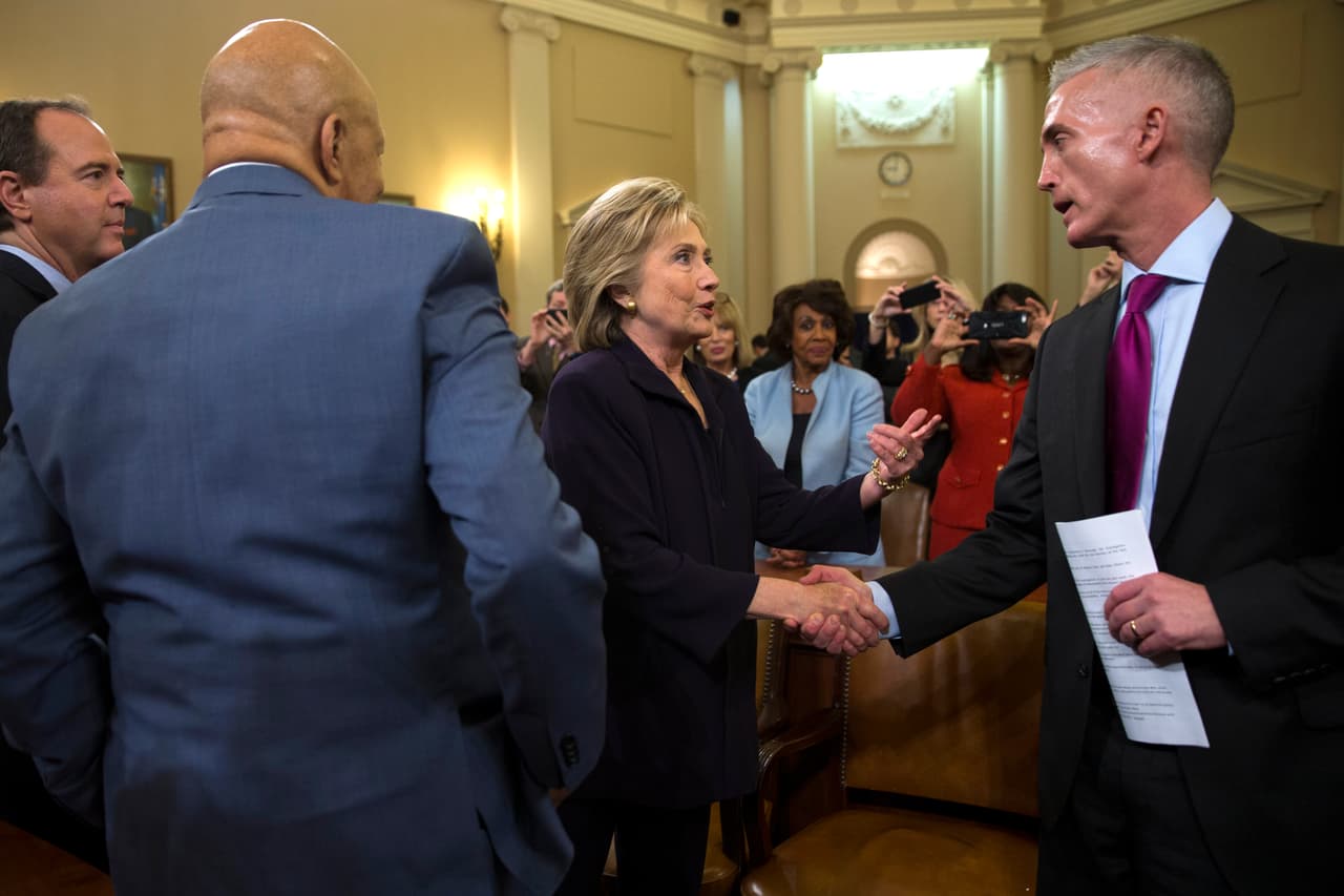 Aquí vemos al presidente del comité, el republicano Trey Gowdy, estrechando la mano de Clinton al concluir el interrogatorio.