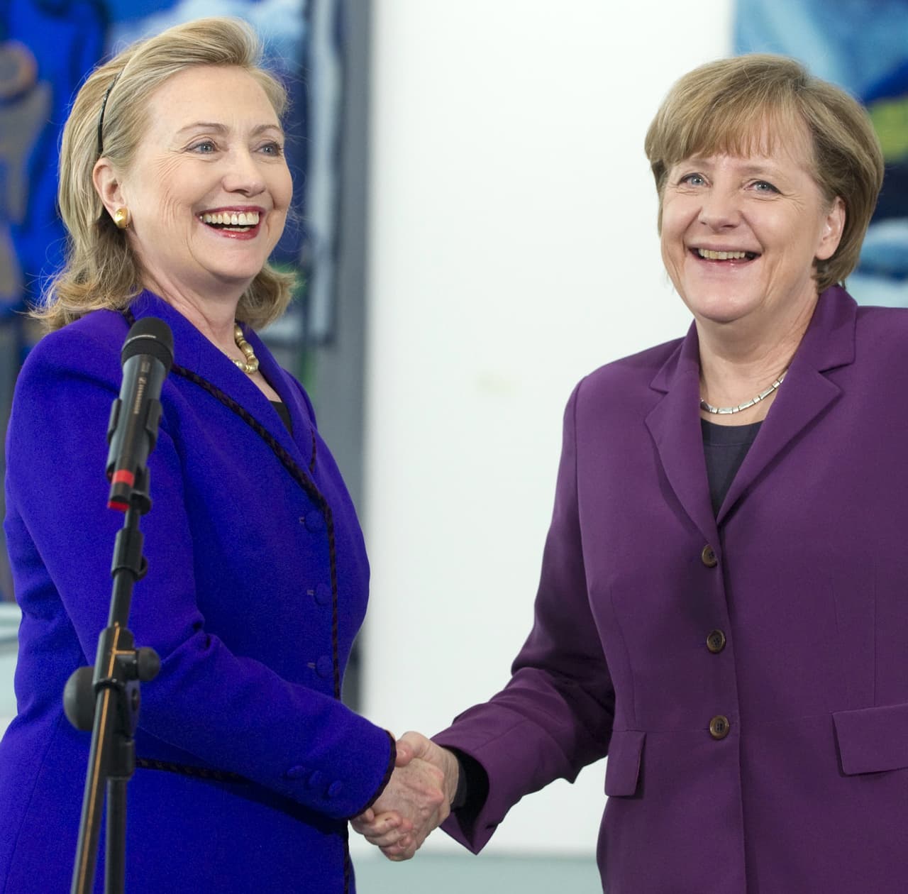 Durante años, Hillary Clinton ha optado por un corte al estilo de Angela Merkel, canciller de Alemania, pero sin flequillo. Ambas comparten el gusto por los tonos dorados. En diciembre del 2012, Barbara Walters, le preguntó sobre el largo de su pelo.