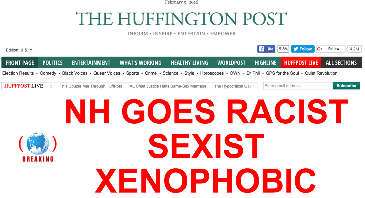 Después de que Donald Trump fue declarado ganador de las elecciones primarias de New Hampshire, el sitio de noticias The Huffington Post declaró en la página principal de su portal que había ganado un “racista”, “sexista” y “xenófobo”