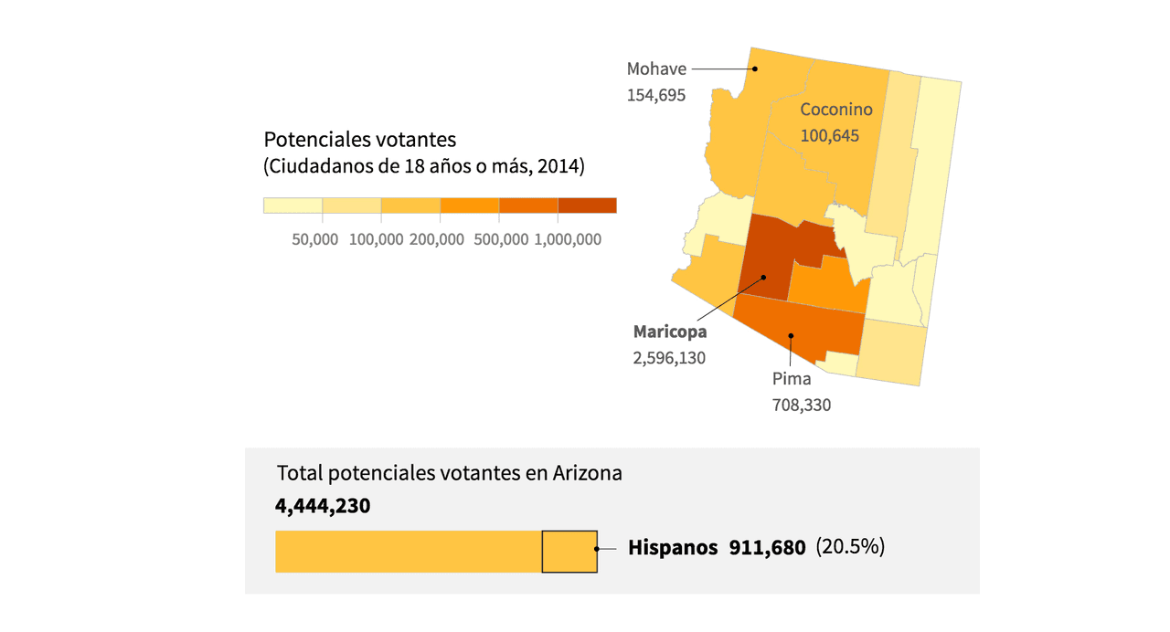 Los hispanos representan el 31% de la población de este estado y suman cerca de 2,1 millones de personas. Según datos del Centro de Investigaciones Pew, al menos 992,000 son votantes.