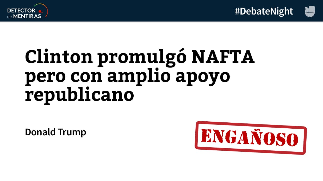 3. Es engañoso apuntar al expresidente Bill Clinton como culpable de NAFTA como dice Trump. El tratado de libre comercio con México y Canadá contó con una amplia mayoría republicana en el Congreso. Para conocer los matices de la afirmación, mira aquí.