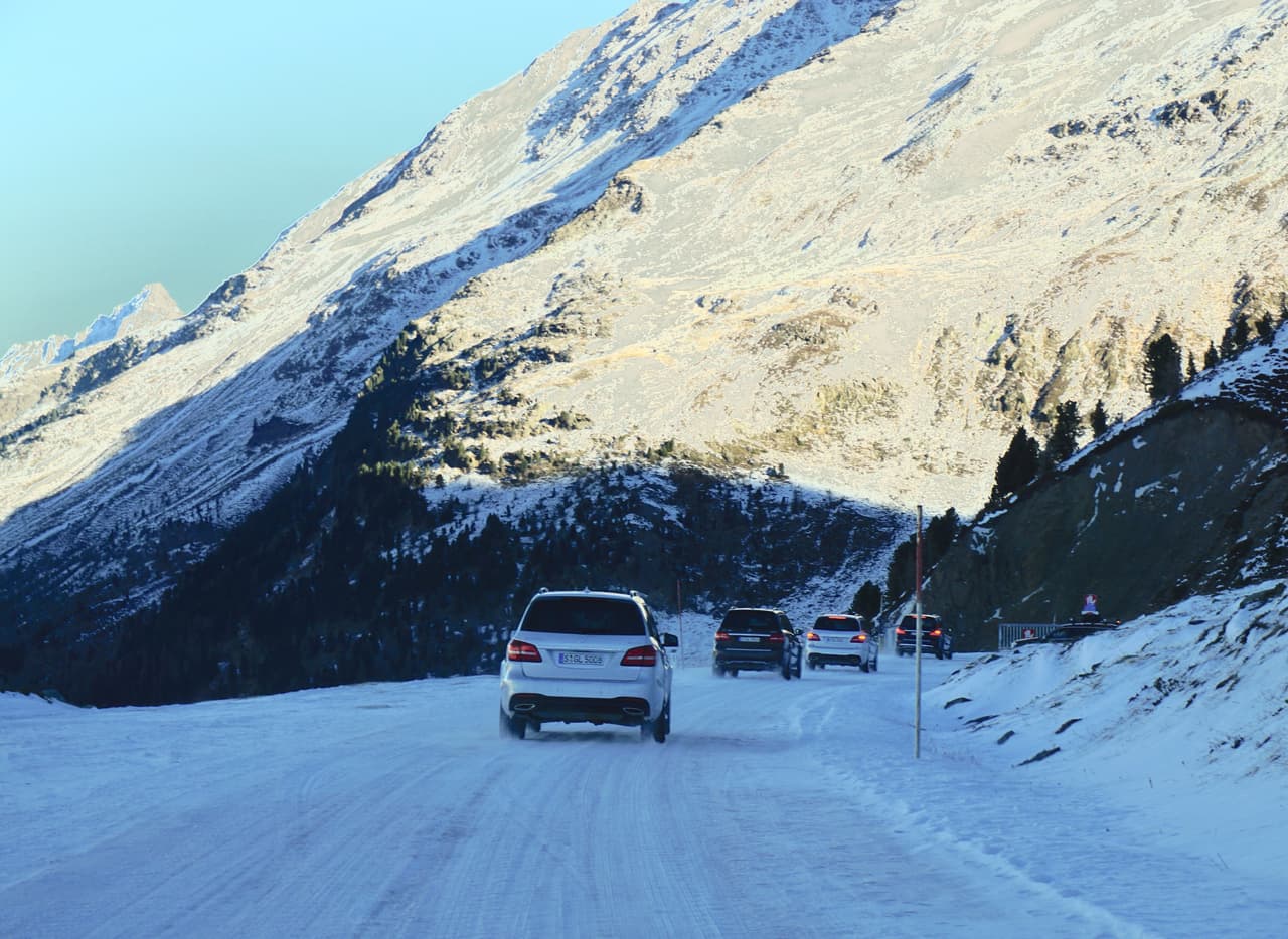 Nuestro recorrido continuó al día siguiente con un exigente viaje de 5 millas por el Timmelsjoch (o Passo del Rombo, como lo llaman en Italia), una desafiante ruta montañera que conecta al valle de Ötztal en el Tirol Austriaco con el Valle de Passeier en la provincia italiana del Tirol del Sur. El asfalto nevado y congelado del Timmelsjoch resultó ser el escenario ideal para probar la capacidad todoterreno de la GLS 2017.
