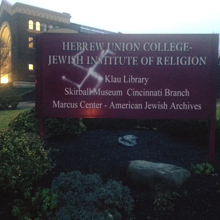 Una gran esvástica blanca apareció en un letrero cerca de la entrada principal del Instituto Hebreo de Cincinnati, Ohio. Miembros del personal presentaron un informe a la policía y eliminaron rápidamente el graffiti antisemita. Fundado en 1875, este instituto fue la primera institución de enseñanza superior judía en Estados Unidos. El alcalde de Cincinnati, John Cranley, dijo que estaba perturbado por el "acto de odio". Reportado por WCPO y Cincinnati.com.