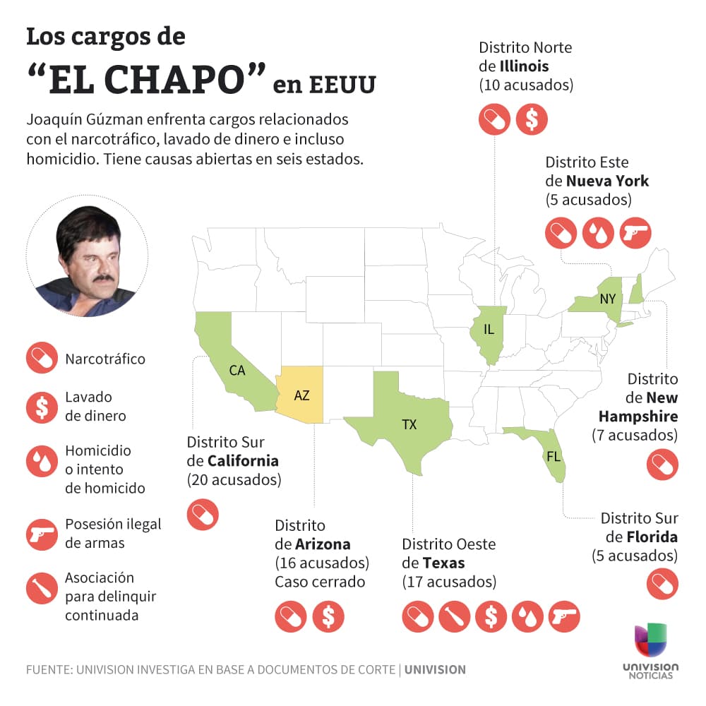 Univisión Investiga revisó cada una de estas causas, los testimonios, documentos y grabaciones que diferentes fiscalías federales están desempolvando en los cuartos de evidencias para demostrar cómo Guzmán inundó de drogas este país durante 20 años. Además del proceso en California, Guzmán enfrenta cargos de narcotráfico, lavado de dinero y homicidio en Texas, Illinois, Nueva York, New Hampshire y Florida. Una causa en Arizona, donde estaban encausados otros 15 colaboradores del capo, fue cerrada en 2012 y algunos de los co-acusados fueron juzgados en casos individuales.