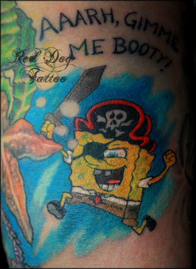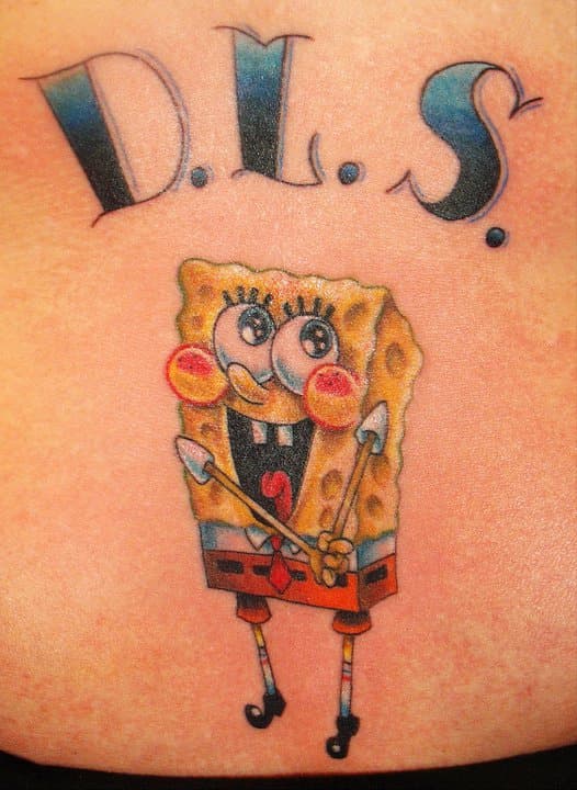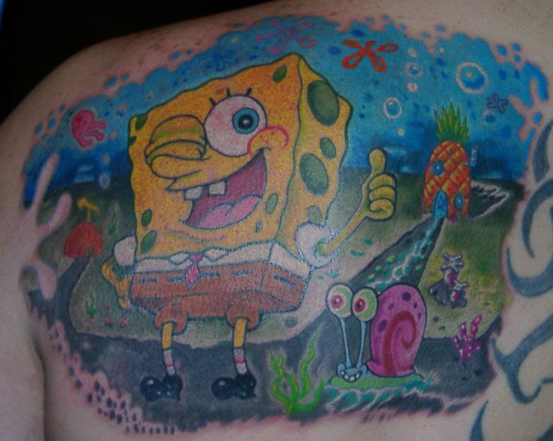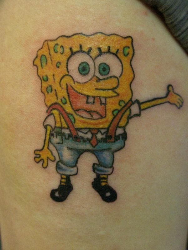 Bob Esponja debe ser uno de los personajes de dibujos animados más absurdo, estúpido y a la vez simpático y genial. Y no debo ser el único que lo piensa así, pues mucha gente ha decidido llevar un tatuaje de esta divertida esponja de mar y sus ridículos amigos.