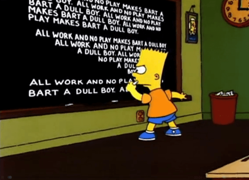 «...Finalmente aparece Bart escribiendo en el pizarrón: ‘No hablaré en clase nunca más‘, y comienza una secuencia idéntica al intro de la serie. Una vez que todos llegan al sofá, comienza el capítulo de Itchy and Scratchy, todos se miran, sonríen, y aparecen los créditos finales». Muy extraño, ¿no crees?