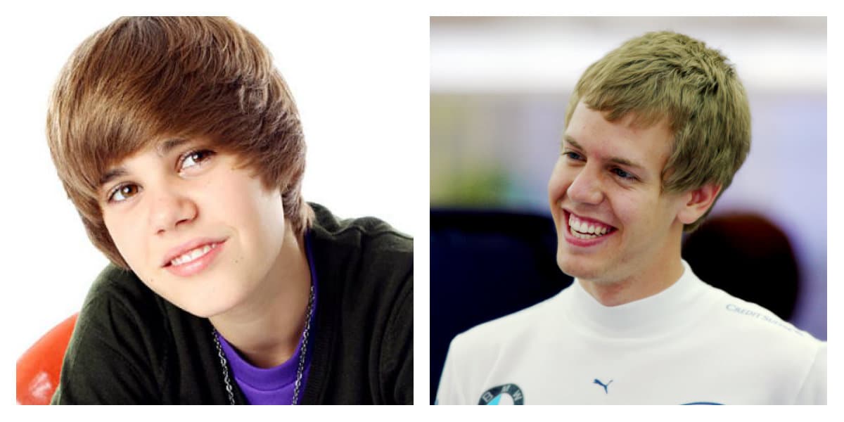 El joven cantante (antes de su renovada imagen) llevaba el cabello largo y peinado hacia abajo. Muy similar al de este piloto. Incluso sonríen de la misma forma. En 2013, Sebastian Vettel se volvió el piloto más joven en ser tetracampeón de la máxima categoría en automovilismo.