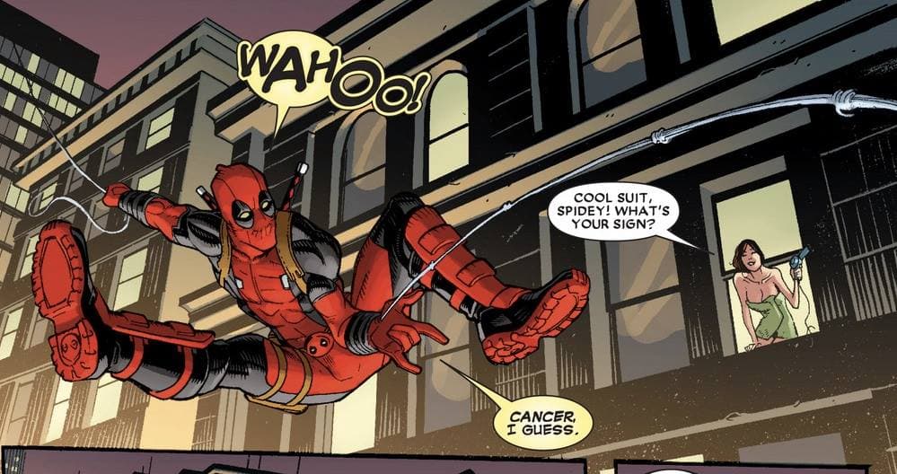 Deadpool sufrió cáncer durante años, pero eso no le impide hacer bromas acerca de su propio dolor y sufrimiento. En una broma clásica, está surcando el cielo con la técnica de Spider-Man cuando le preguntan de qué signo es.