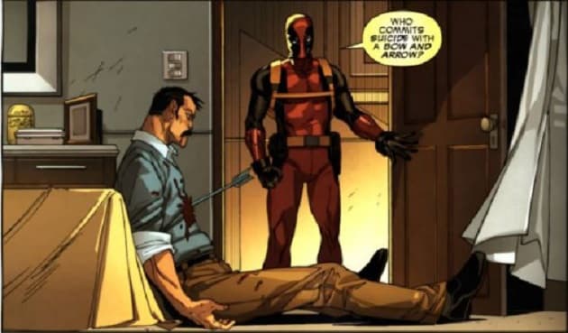El suicidio es un tema tabú, pero Deadpool no se intimida. Ingresa en un lugar donde claramente ha habido un asesinato, pero en su estupidez no hace más que preguntarse: ¿quién es tan tonto para suicidarse con un arco y una flecha?