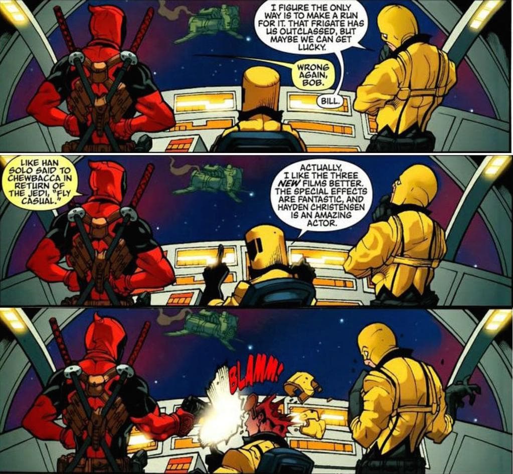 En un cómic Deadpool hace un comentario sobre Star Wars y un piloto le dice que prefiere las tres películas más recientes. Sin mediar ninguna explicación Deadpool lo ejecuta, porque evidentemente no le gustaron ni Hayden Christensen ni Jar Jar Binks.