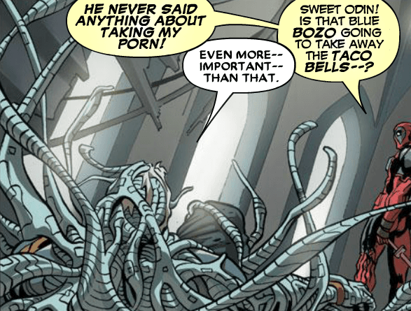 Deadpool siempre suele aliviar la tensión del momento con bromas. En esta ocasión nos revela que lo que más quiere en el mundo es su colección de pornografía, aunque quizás la cadena de comida rápida Taco Bells también es muy importante.