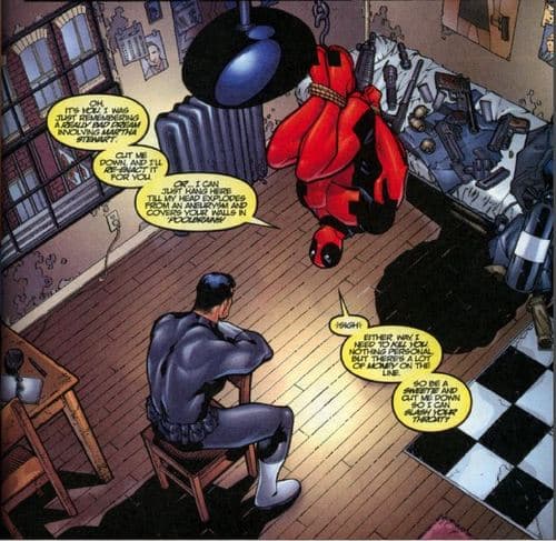 Deadpool suele insultar en Internet de forma regular. Para hacerse a la idea de su uso del humor, en una historia con Spider-Man los dos héroes están trepando un edificio con Wade llevado a caballito.