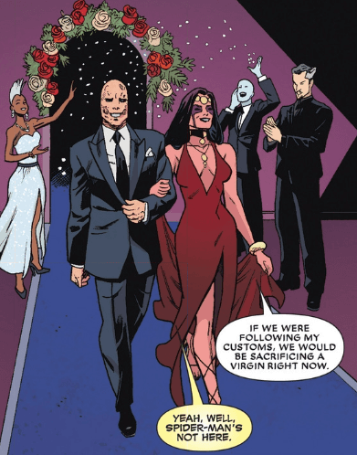 Si bien Deadpool inspira parte de su traje en el de Spider-Man, e incluso han trabajado juntos, nunca deja pasar la oportunidad para hacer bromas a costa suya. Ni siquiera el día del casamiento de Wade Wilson con Shiklah se salvó el hombre araña.