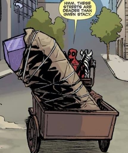 Deadpool incluso hizo bromas sobre la muerte de Gwen Stacy, la primera persona que Peter Parker amo. En un número de The Gauntlet, mientras Deadpool caminaba por Grecia, dice que algunas de las calles están más muertas que Gwen.