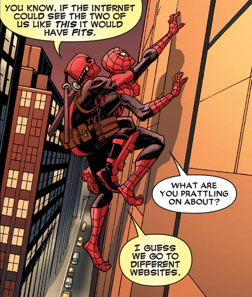 En ese momento Deadpool no tiene mejor idea que remarcar que en ciertos sitios web estarían encantados con la fotografía de Spiderman y Deadpool en una posición tan extraña. Este personaje sí que sabe bromear con temas de actualidad.