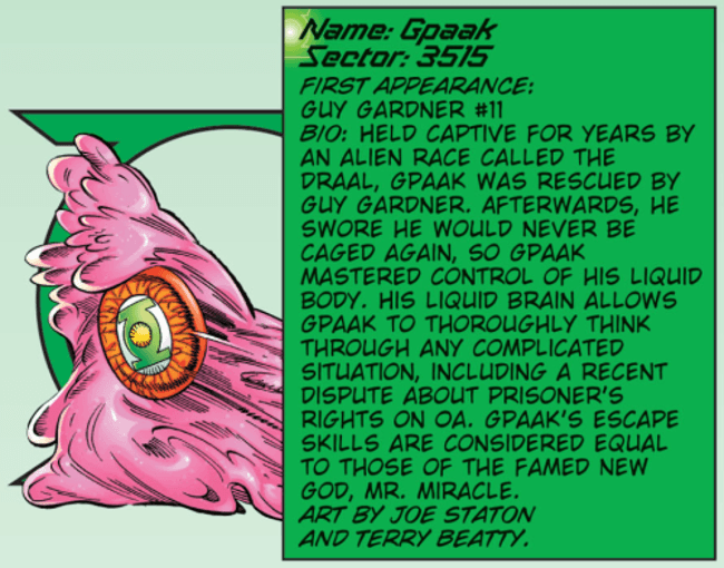 Gpaak, es una forma de vida constituida por materia líquida amorfa, la cual fue rescatada por Guy Gardner de un largo cautiverio. Luego de ser liberado, se promete a sí mismo hacerse fuerte, controlando su estructura y habilidades.