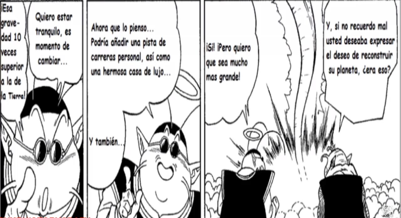 El gran patriarca del nuevo Namek llega con ellas y llama a Porunga, el Kaio del norte le comenta que desea un planeta más grande y que tenga una pista de carreras. Además, desea que la gravedad sea menor a la anterior (10 veces mayor a la de la Tierra).