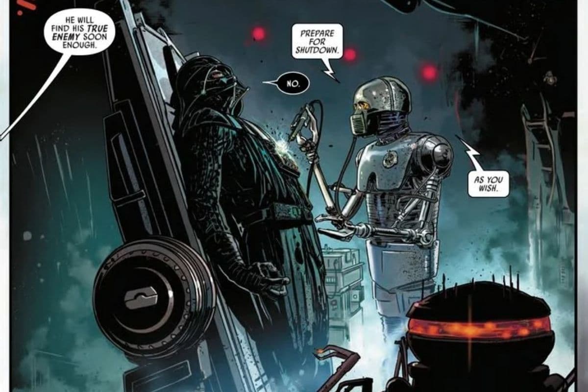 Para ello, el robot le advierte que se prepare para apagarse; sin embargo, Vader opta por mantenerse despierto durante el procedimiento.