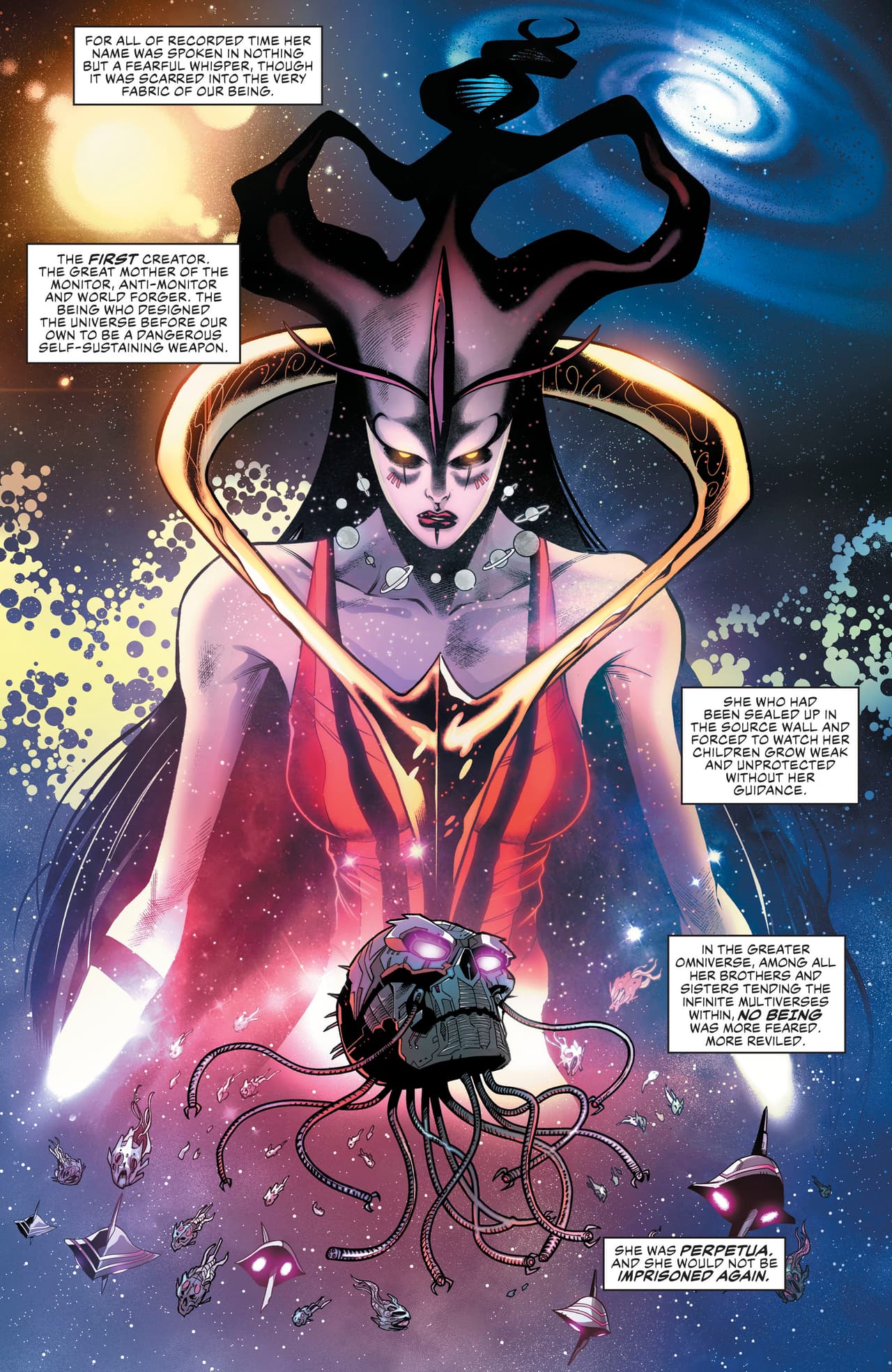Cada evento de las crisis de DC sirvieron para presentar a nuevos personajes del panteón de DC. Perpetua era el ser que controlaba todo desde las sombras, con el objetivo de gobernar el multiverso.