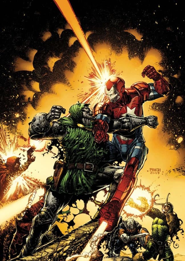 La imagen que ven aquí permanece anónima respecto a su procedencia y contenido, ya que bien podría tratarse de un especial o un número más de una serie regular. Sin embargo si la examinan más de cerca (después del salto) verán que no solo Doom y Osborn están en conflicto sino que varios miembros más del cabal secreto parecen estar revelando su verdadera naturaleza.