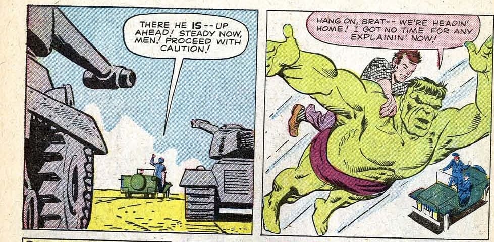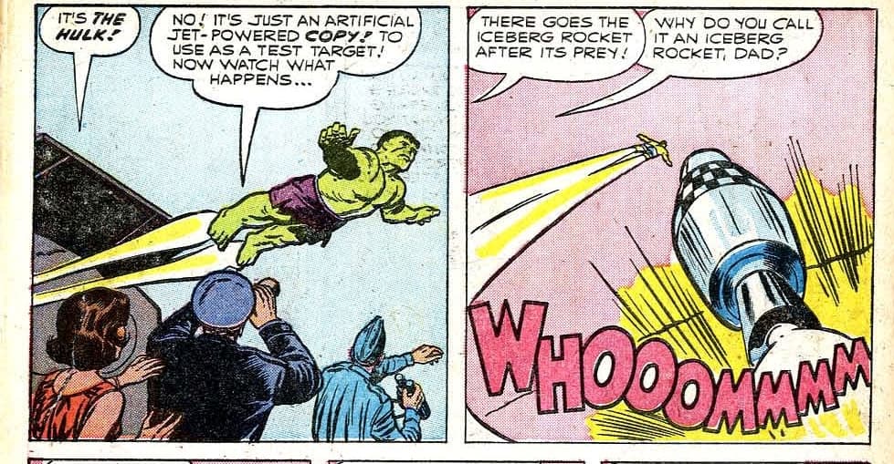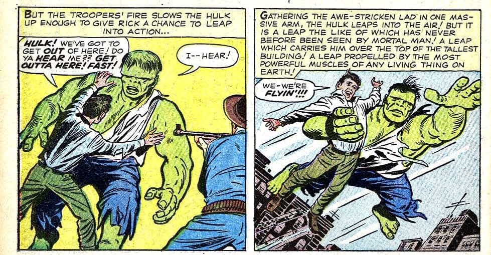 Pero, al parecer el propio Jack Kirby también se equivocó un poco con la nueva habilidad, ya que en los últimos paneles del cómic se ve como Hulk carga a Rick Jones en su espalda y vuela, cambiando la dirección de su trayectoria con los brazos extendidos como los de Superman.