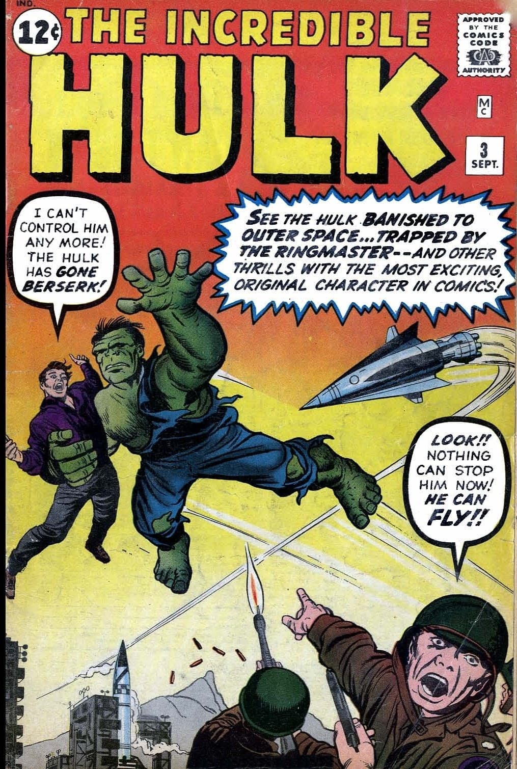 Fue en The Incredible Hulk #3 cuando un soldado en la portada nos da la noticia del nuevo poder de Hulk, al gritar «¡Mira!, nada puede detenerlo ahora, ¡Puede volar!»
