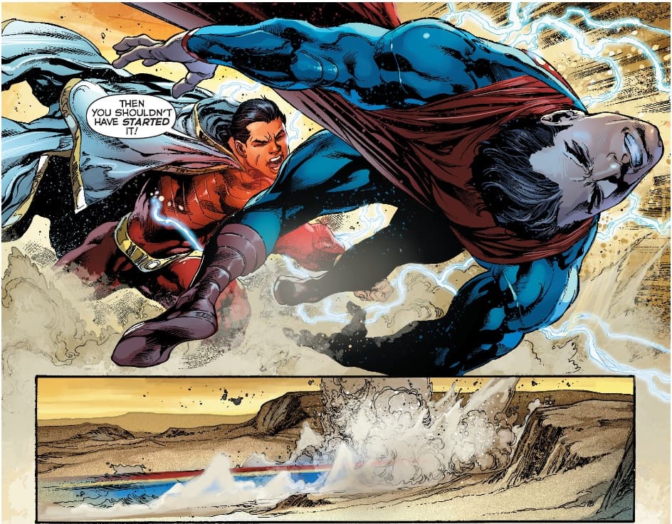 En cambio, la magia es el elemento primordial de Shazam, y en la obra impresa de Kingdom Come, los rayos mágicos de Billy Baston son suficientes para dejar inutilizado a Clark.