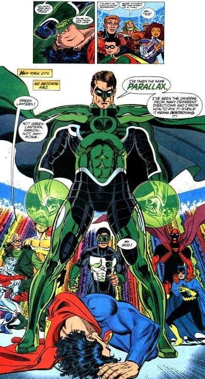 Aunque Hal Jordan no podría compararse en habilidades con Superman, cuando Parallax lo emuló en el debut de la saga Hora Cero, pudo abatir al buen Clark sin ningún problema.