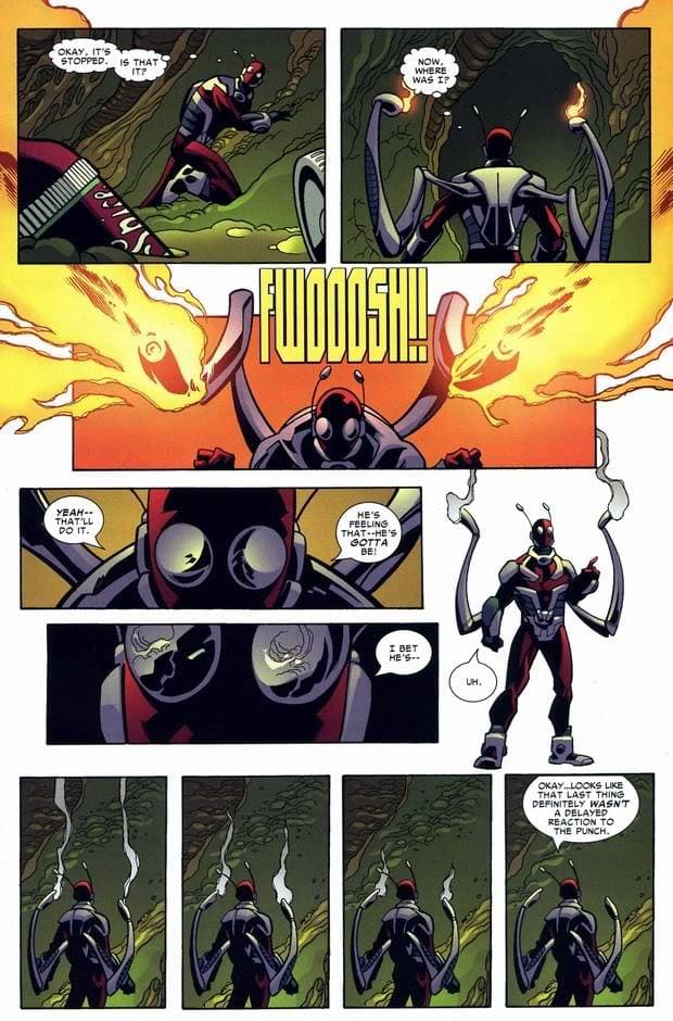 Lo más increíble es como llegamos a enterarnos de esta extraña habilidad. Durante la poco exitosa serie The Irredeemable Ant-Man, Eric O’Grady, también conocido como el cuarto Ant-Man, tuvo un combate mano a mano con Hulk. El inteligente héroe intento vencer al gigante a través de miniaturizarse e ingresar en su cuerpo, donde dio rienda suelta a su poderoso lanzallamas. ¿El resultado? Bueno, puede leerse en el título.