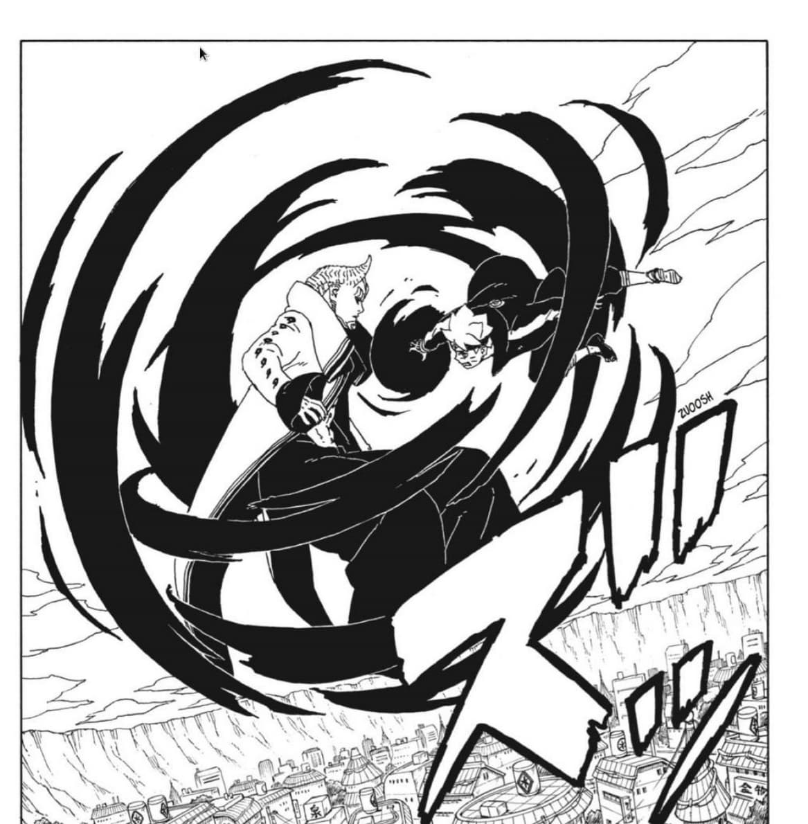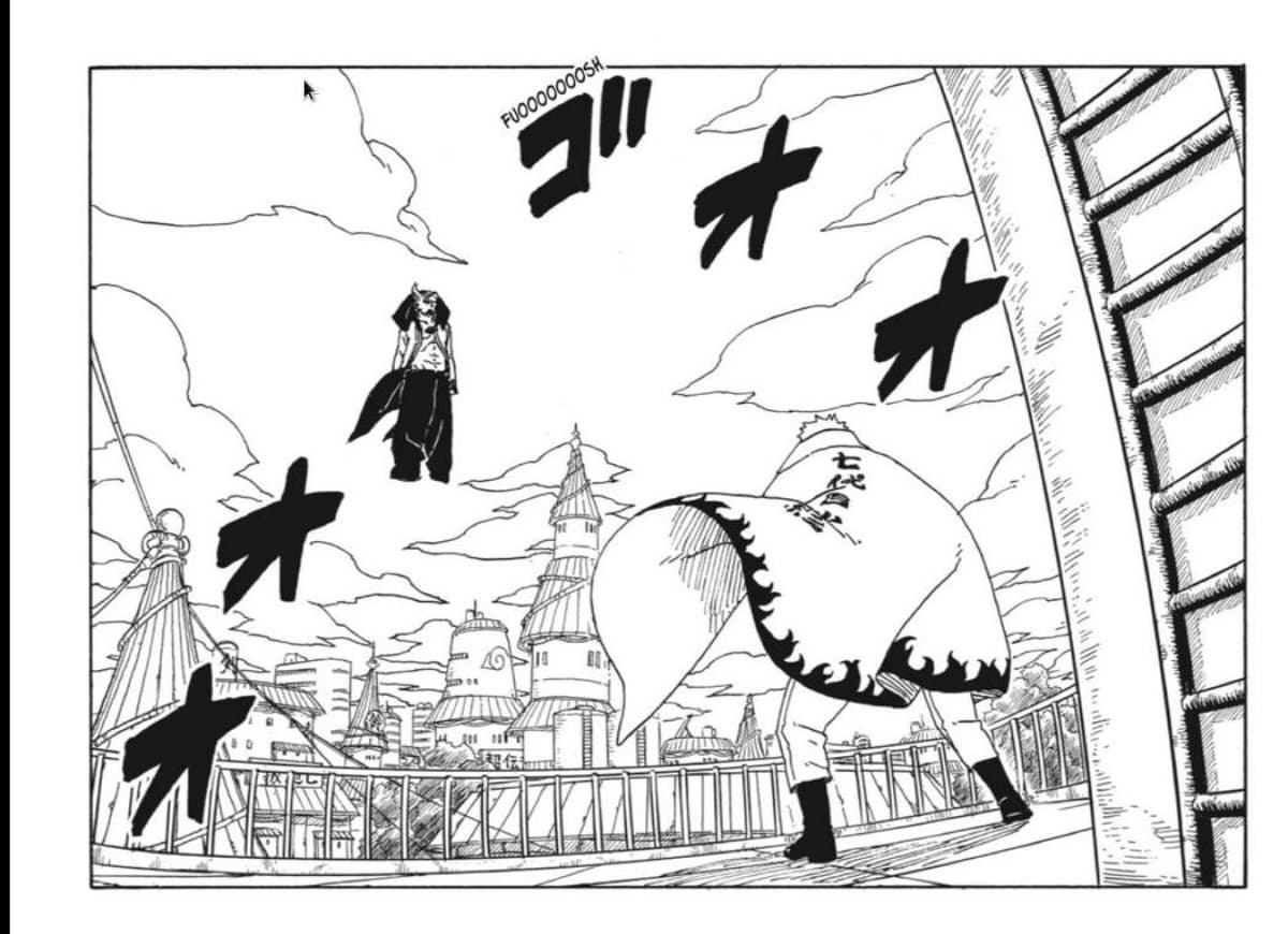 La pelea se reinicia, Isshiki ataca a Naruto, pero a diferencia de antes, con su nueva transformación el Hokage no solo le sigue el ritmo, sino que parece que supera al Otsutsuki.