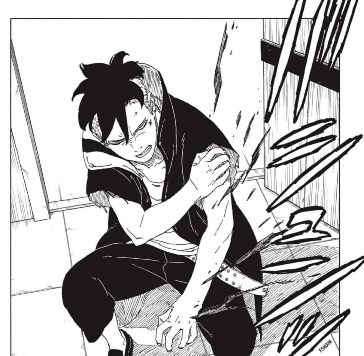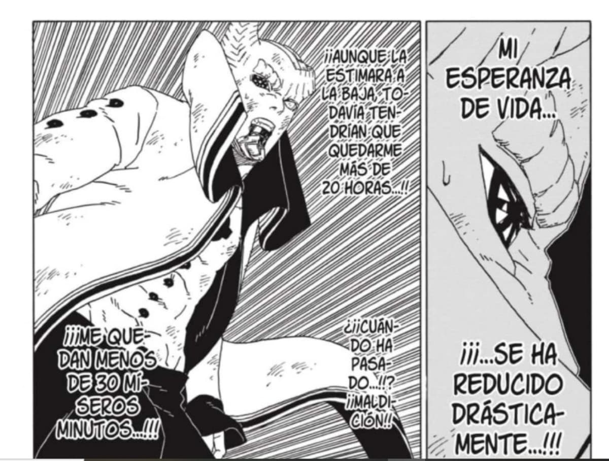 Cuando ya solo le quedaban 10 minutos de vida, Isshiki descubrió el chakra de Naruto que se encontraba en el brazo de Kawaki, por lo que vio una oportunidad para su victoria.