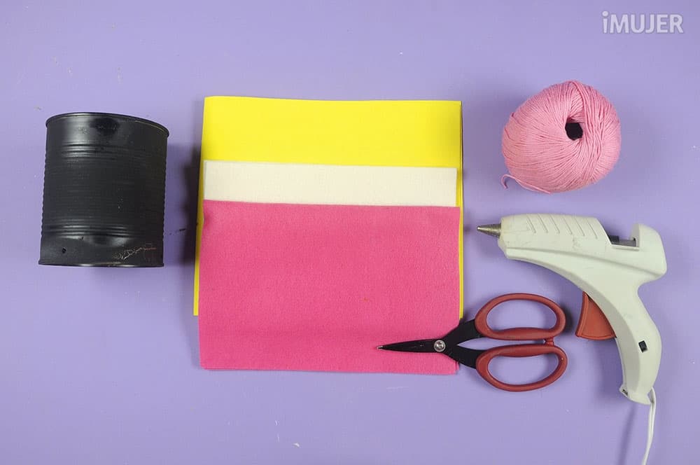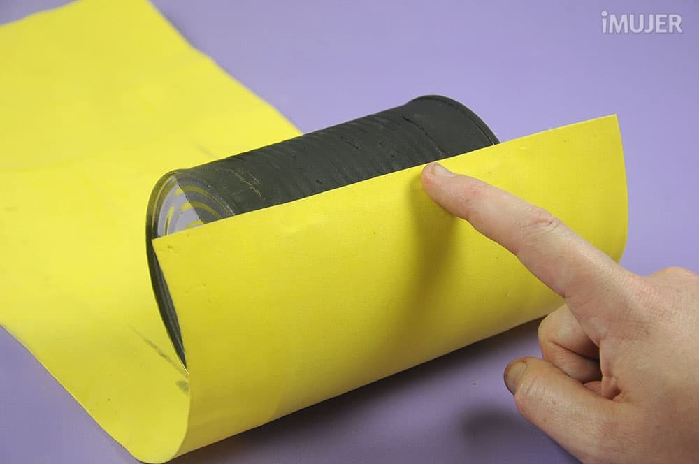 Corta una lámina de goma eva lo suficientemente grande para forrar la lata y pégala con silicona.