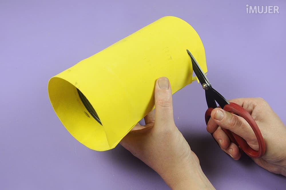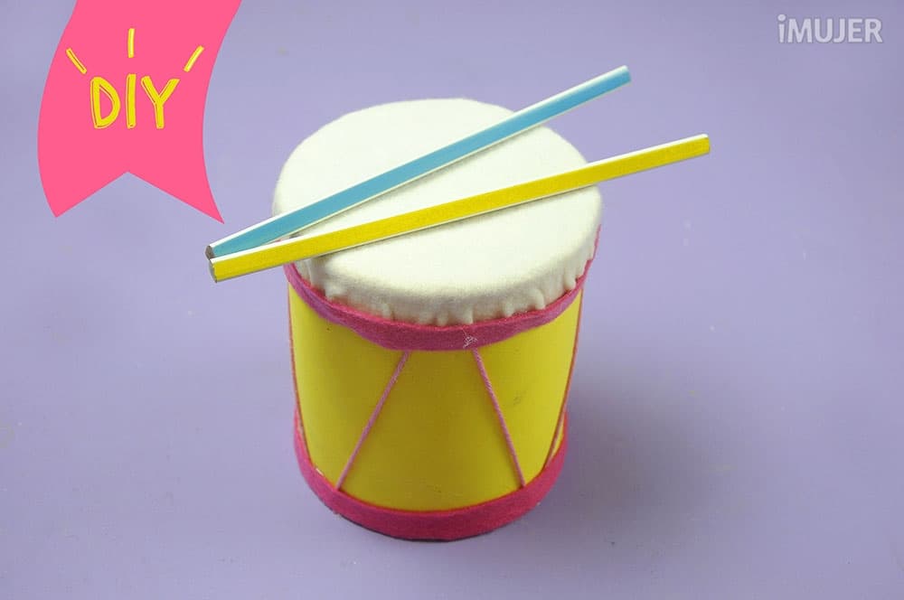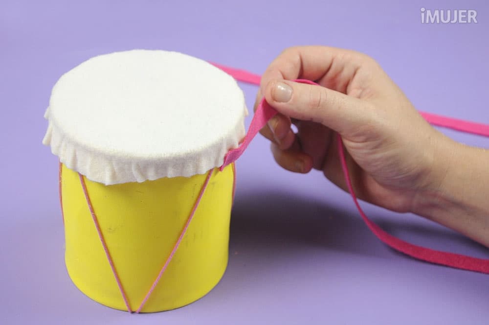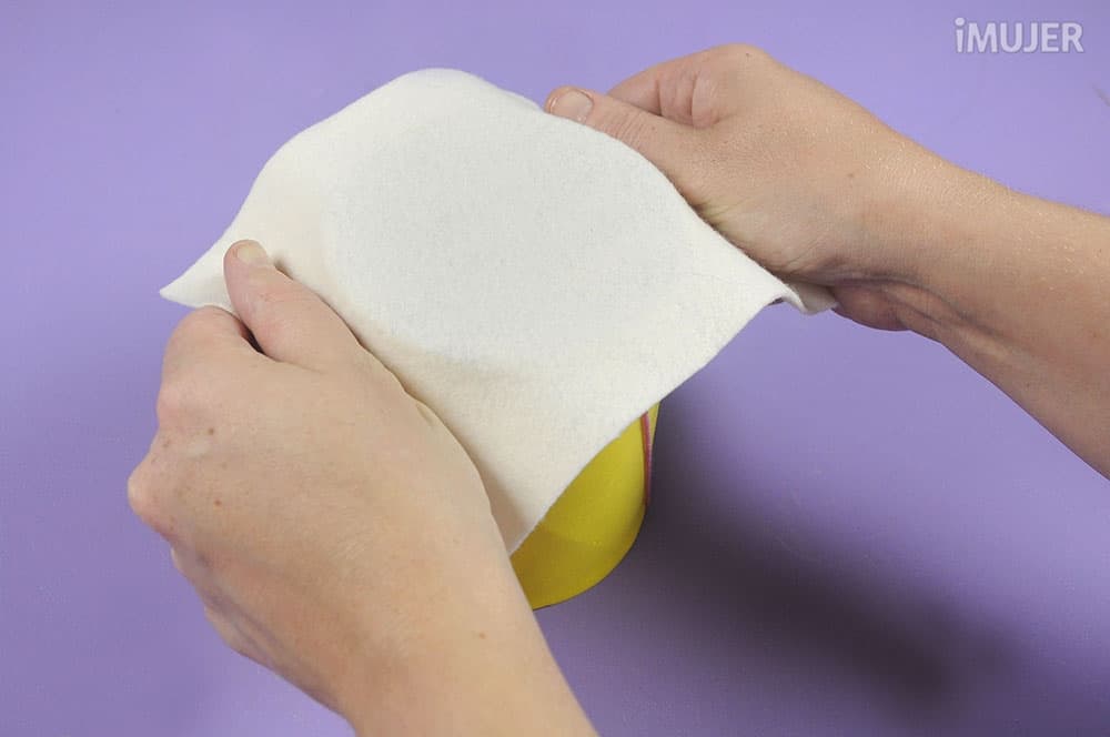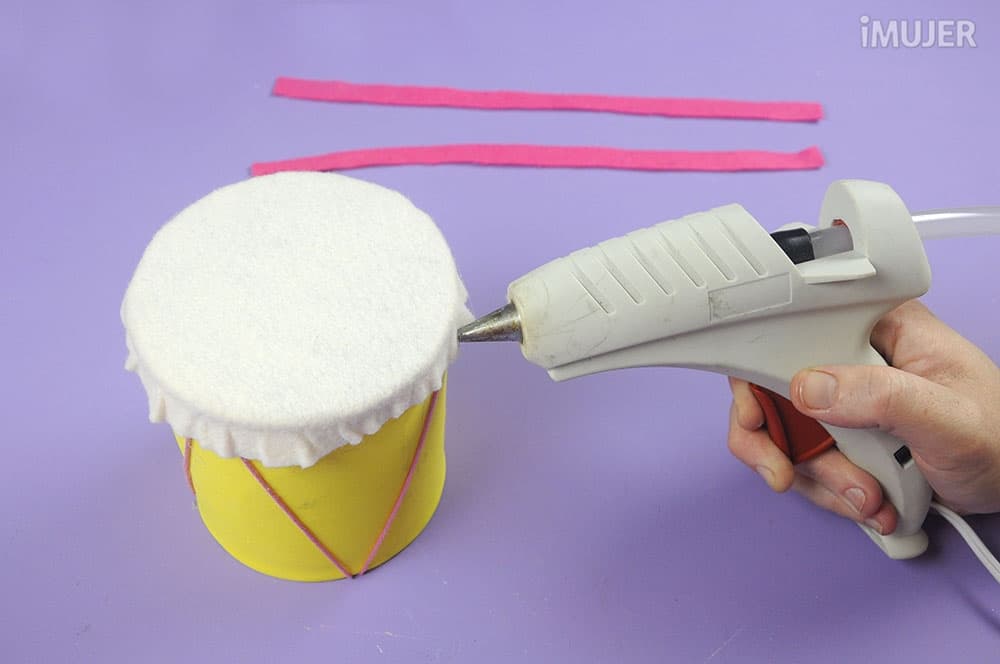 Por último, pega las dos láminas de fieltro, una en la parte superior y otra en la parte inferior del tambor.