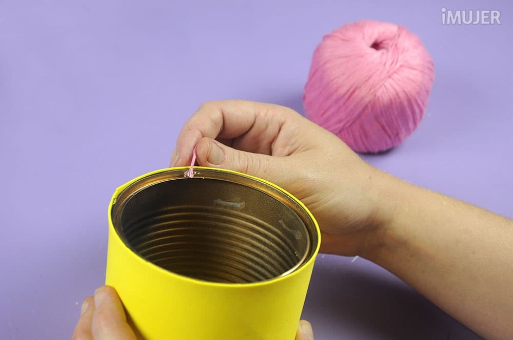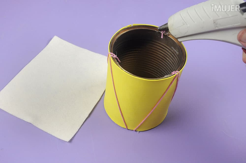 Cuando hayas terminado con el hilo ponle silicona a la superficie de la lata.