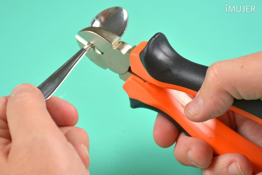Toma la otra pinza para doblar el mango de la cuchara hasta darle la forma de un anillo. ¡Vas a ver que es más fácil de lo que parece!