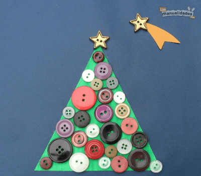 Para hacer la tarjeta de Navidad con forma de árbol simplemente tienes que pegar los botones sobre una cartulina formando un triángulo. Si tienes botones de estrella, coloca uno en la punta del arbolito y otro formando una estrella fugaz.