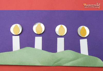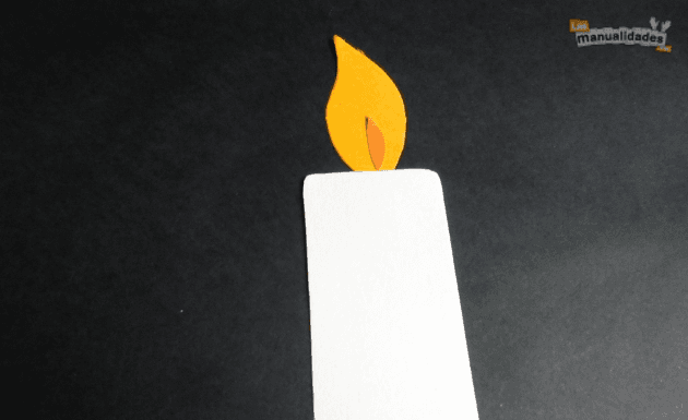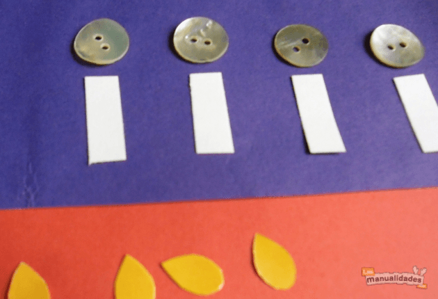 Comienza pegando sobre una cartulina de color 4 rectángulos de papel blanco que serán los cabos de vela. Encima de ellos coloca y pega los botones. Luego corta en papel amarillo las llamas de las velas, en una medida un poco más pequeña que los botones.