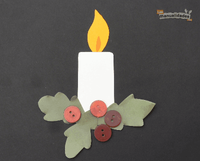 Con botones y papel de colores también puedes hacer una tarjeta de Navidad con una vela. Para ello, corta en papel blanco la forma de la vela, corta en papel amarillo la llama y, en papel naranja, una llama más pequeñita, para pegar encima.