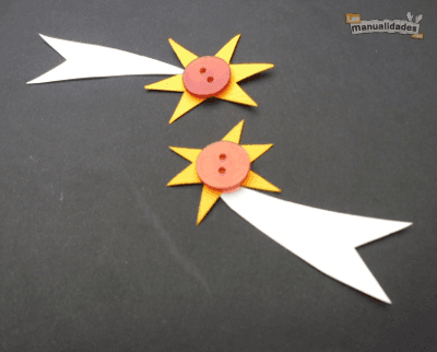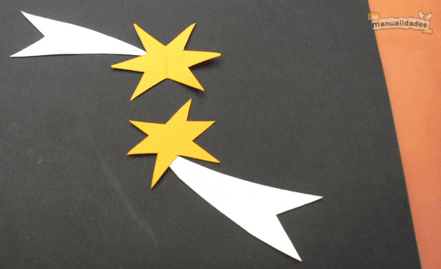 Recorta la forma, corta en papel blanco las colas de las estrellas fugaces y pégalas sobre la cartulina.