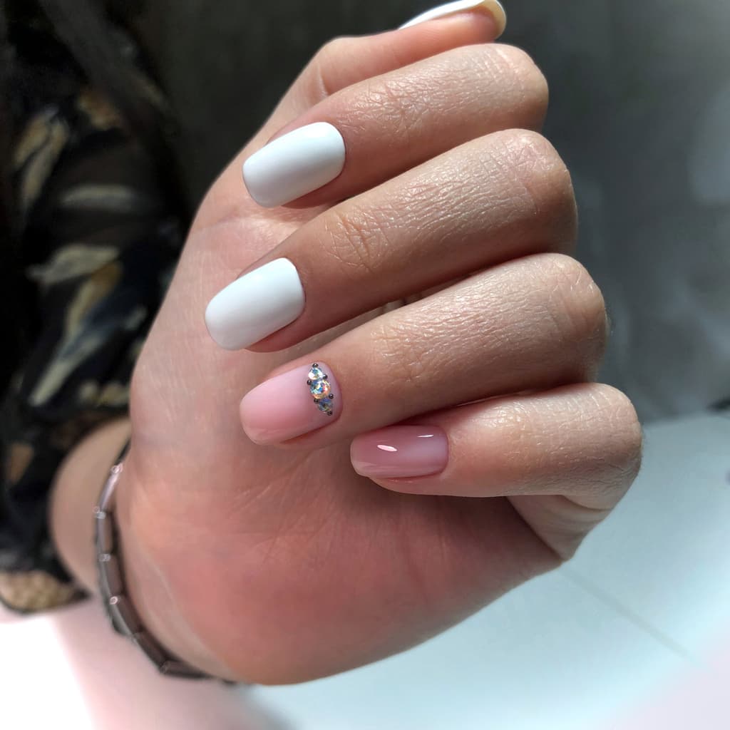 Este diseño es perfecto cuando eres la novia, tus manos se verán como las de una princesa. Llevar algunas uñas en tono blanco y otras con transparencias da como resultado un estilo sofisticado, mientras los cristales lucen simplemente mágicos.